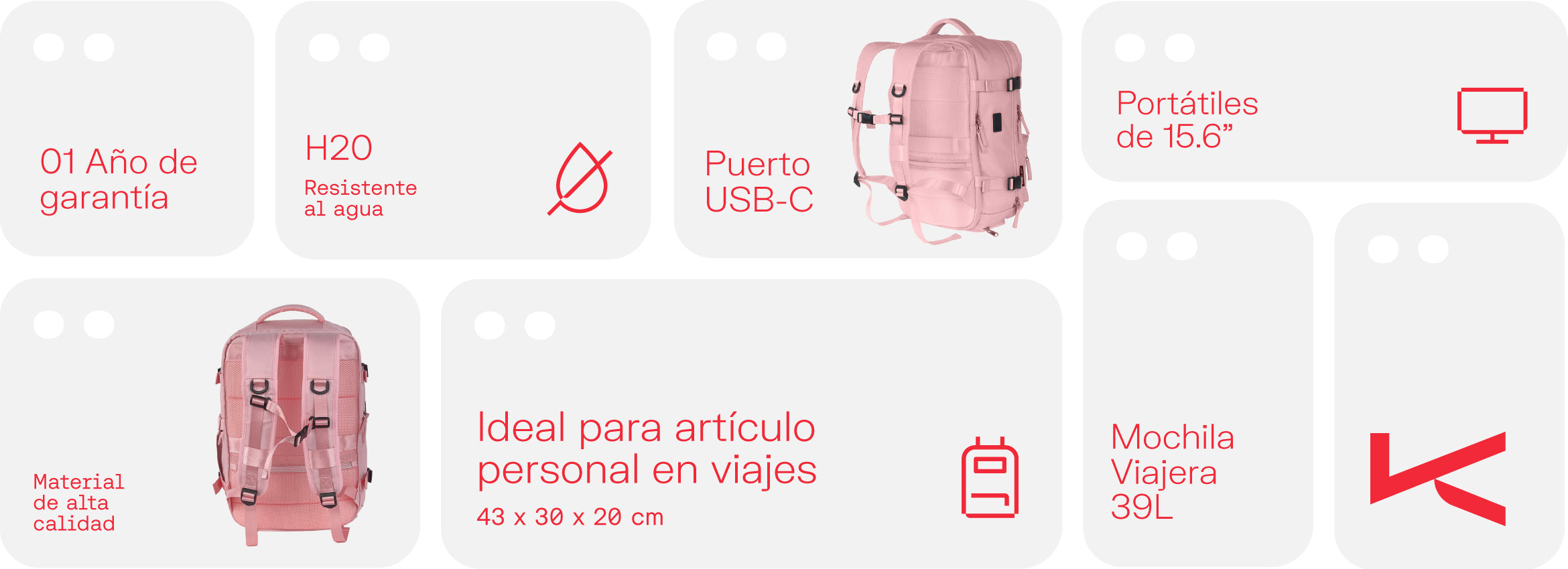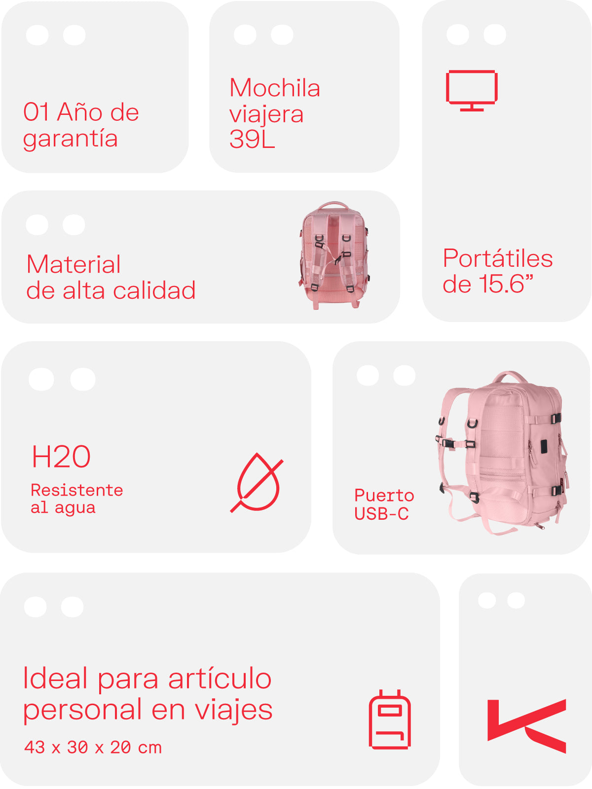- Aceptada como equipaje de mano: 43cm x 33cm x 15cm