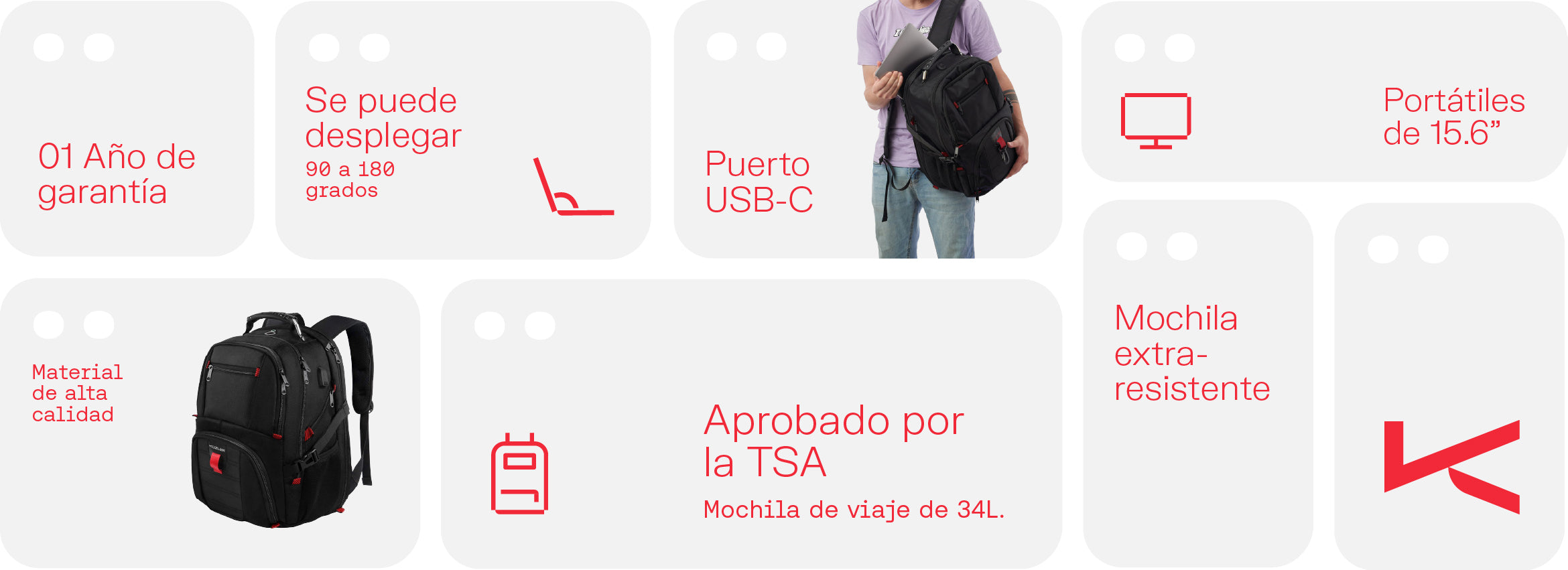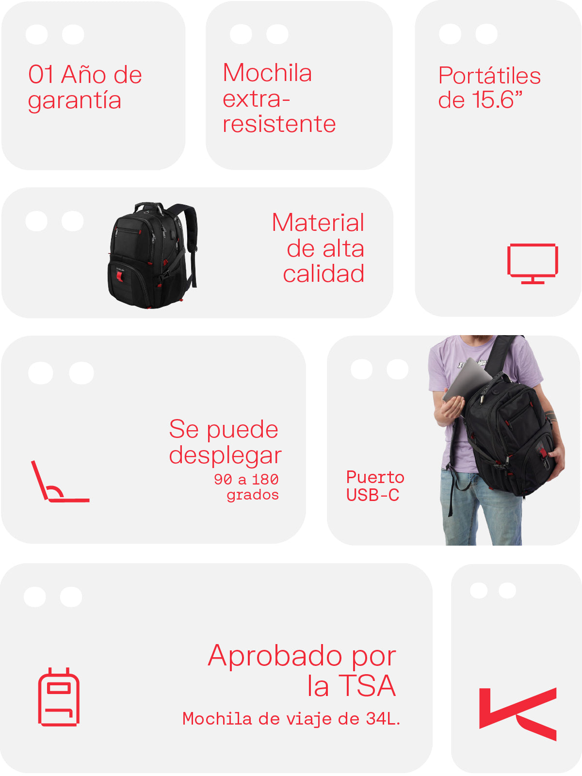 - Capacidad 34 litros o para una laptop de 15.6" pulgadas.